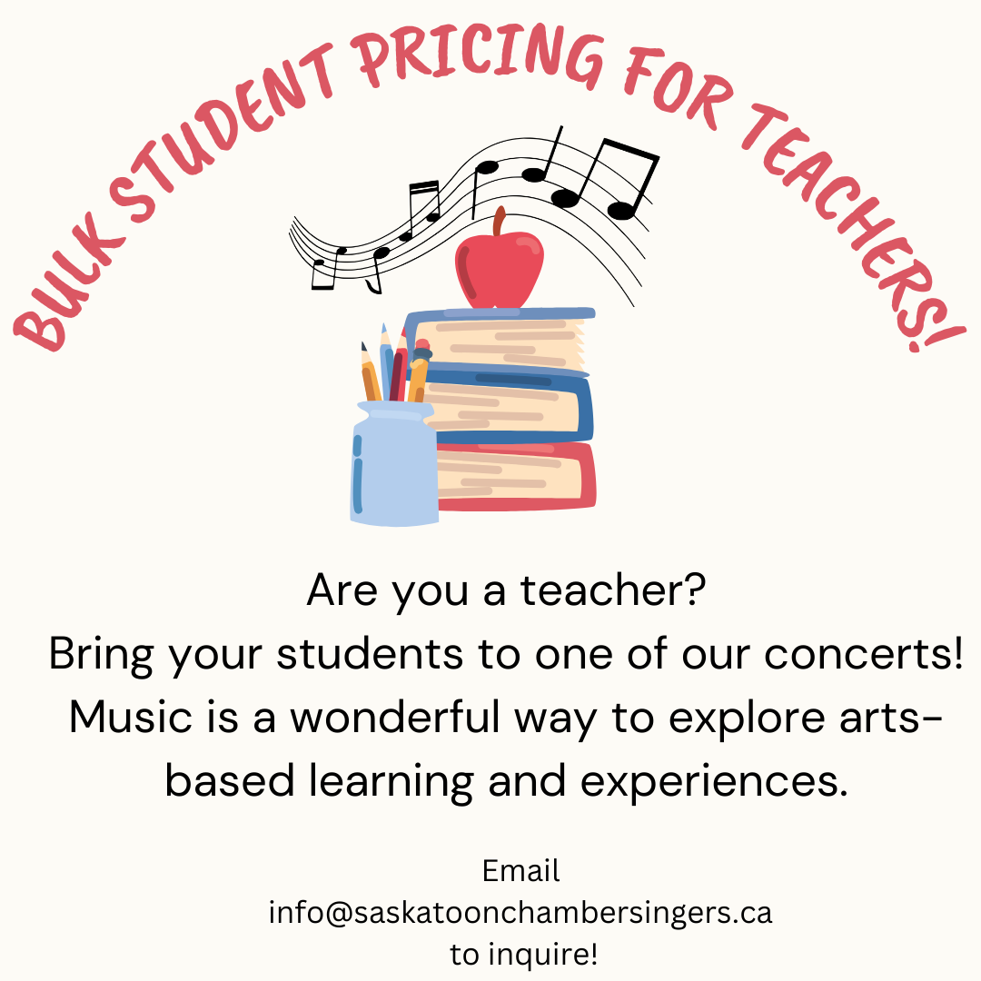 The Saskatoon Chamber Singers recognizes that attending live choral performances is an important part of learning about singing, being a part of an ensemble, and about music appreciation generally. If you are a teacher (music, band, choir, arts, sports, etc), and you would like to bring your class to our concerts, please reach out to us!